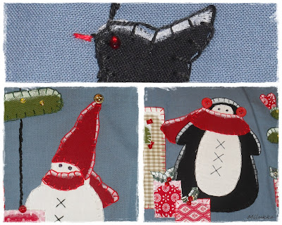 Kuvat on liimanauhan kanssa silitetty kankaaseen ja applikoitu napinläpipistoilla. Kaikenlaisia helmiä kaivelin kätköistä ja vähän koristelin niillä